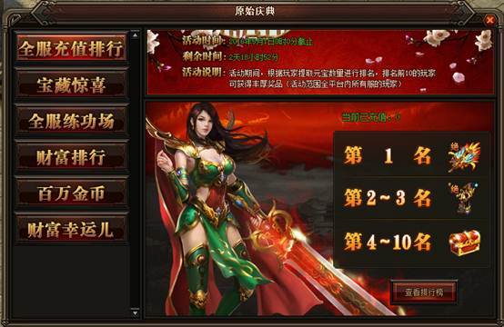 活动详情:活动期间系统会根据玩家提取的元宝数量来进行排名,此活动是按照全服的充值榜来算的,奖品会在活动结束后次日通过邮件发放给玩家。