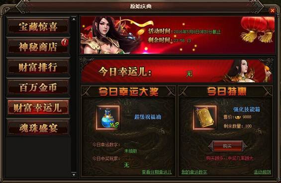 活动详情:活动期间每天0-21点可以购买特惠礼包,每服限量100个,购买特惠礼包可以获得1-100的幸运数字,数字不会重复,每天的21:00系统会随机抽取一个幸运数字,中奖的玩家将会获得该日的幸运大奖,奖品会通过邮件的方式发放给玩家