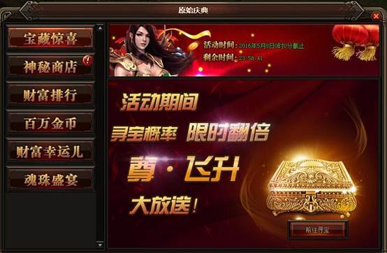 活动详情:活动期间在游戏寻宝界面进行寻宝,寻宝概率大大提升,而且终极装备的寻宝产出几率也会大大提升。