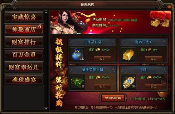 活动详情:活动期间玩家可以在神秘商店低价购买自己所需要的道具,每消耗399元宝可刷新一次,刷新后道具栏里会随机刷出不同的道具,玩家可以消耗点、金币、元宝来进行购买。