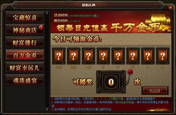 活动详情:活动期间充值领取每日充值5档奖励,分别可获得4、1、1、1、1次摇杆次数,摇杆的次数会从低到高显示,每日充值的档次后面一档都会高出前面10倍金币收益,如果一天5档的领完就可获得当天金币的最大收益,获得的金币将在每日0点通过邮件的方式发送给玩家。