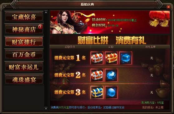 活动详情:活动期间消费满20W元宝就可以参与排行,活动结束后奖励会已邮件的方式发放给玩家,一定要记得提取~