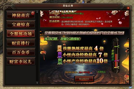 活动详情:小伙伴们是不是在为上次的练功房没有多买点时间而懊恼呢,不要桑心~~练功房又来了哦。活动期间玩家可以购买练功场时间,练功场分初级、中级、高级区域,每个区域的时间及价格不同,全服购买练功时间达到相应等级后开启全服练功场。黄色等级条要求全服购买时间为50小时、紫色等级条要求全服购买时间为500小时、绿色等级条要求全服购买时间为1500小时,每个等级所获得的奖励各不相同。