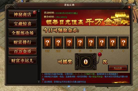 活动详情:活动期间充值领取每日充值5档奖励,分别可获得4、1、1、1、1次摇杆次数,摇杆的次数会从低到高显示,每日充值的档次后面一档都会高出前面10倍金币收益,如果一天5档的领完就可获得当天金币的最大收益,获得的金币将在每日0点通过邮件的方式发送给玩家。