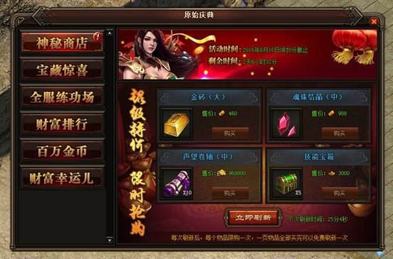 活动详情:神秘商店又来了哦,小伙伴们可以已使用金币、礼金、元宝在神秘商店内购买所需道具,只要399元宝就可以进行刷新,每样只能购买一次,如果这一页的购买完了可以免费刷新一次。