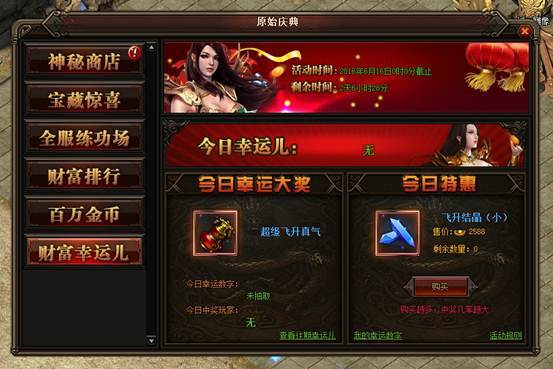 活动详情:活动期间玩家可在今日特惠里以优惠的价格购买相应的道具,每购买一次便可获得相应的一个幸运数字。系统会随机抽取一个幸运数字,每日21:00开奖,如果被系统抽到的幸运玩家就可获得今日幸运大奖,数量有限先到先得。