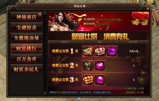 活动详情:活动期间消费满20W元宝就可以参与排行,活动结束后奖励会已邮件的方式发放给玩家,一定要记得提取~
