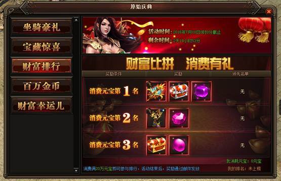 活动详情:活动期间消费满20W元宝就可以参与排行,活动结束后奖励会已邮件的方式发放给玩家,一定要记得提取~