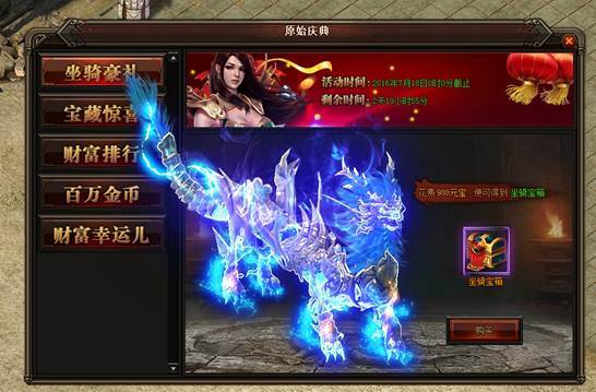 活动详情:活动期间玩家可以购买坐骑宝箱,打开坐骑宝箱会随机开出坐骑碎片,玩家可使用碎片合成完整坐骑,更有几率直接开出完整坐骑哦。