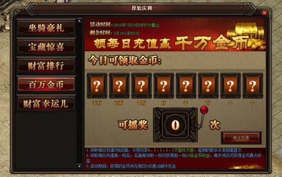 活动详情:活动期间充值领取每日充值5档奖励,分别可获得4、1、1、1、1次摇杆次数,摇杆的次数会从低到高显示,每日充值的档次后面一档都会高出前面10倍金币收益,如果一天5档的领完就可获得当天金币的最大收益,获得的金币将在每日0点通过邮件的方式发送给玩家。