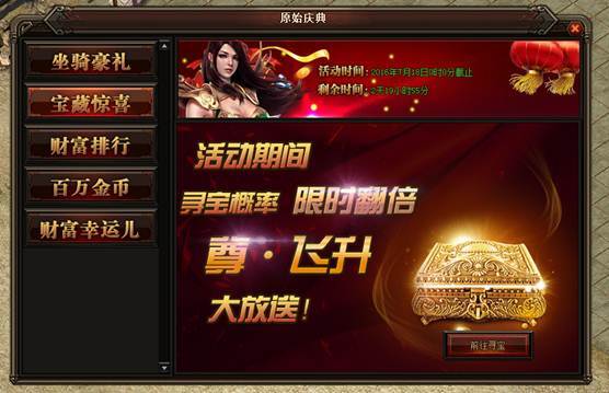 活动详情:活动期间寻宝概率限时翻倍哦,各种极品装备、道具等你来拿,更有尊·飞升大放送,千万不要错过哦~~