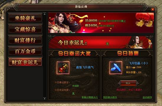 活动详情:活动期间玩家可在今日特惠里以优惠的价格购买相应的道具,每购买一次便可获得相应的一个幸运数字。系统会随机抽取一个幸运数字,每日21:00开奖,如果被系统抽到的幸运玩家就可获得今日幸运大奖,数量有限先到先得。
