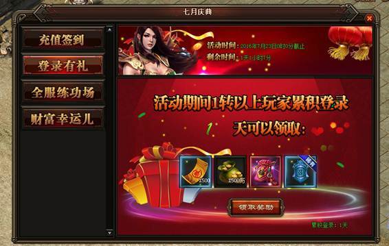 活动详情:活动期间1转以上的玩家,每日登录即可领取奖励,活动为期3天,小伙伴们不要错过哦~