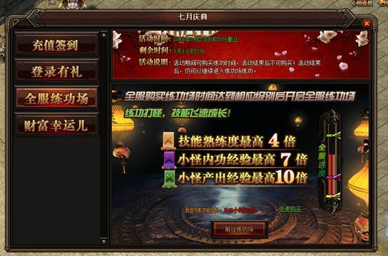 活动详情:小伙伴们是不是在为上次的练功房没有多买点时间而懊恼呢,不要桑心~~练功房又来了哦。活动期间玩家可以购买练功场时间,练功场分初级、中级、高级区域,每个区域的时间及价格不同,全服购买练功时间达到相应等级后开启全服练功场。黄色等级条要求全服购买时间为50小时、紫色等级条要求全服购买时间为500小时、绿色等级条要求全服购买时间为1500小时,每个等级所获得的奖励各不相同。