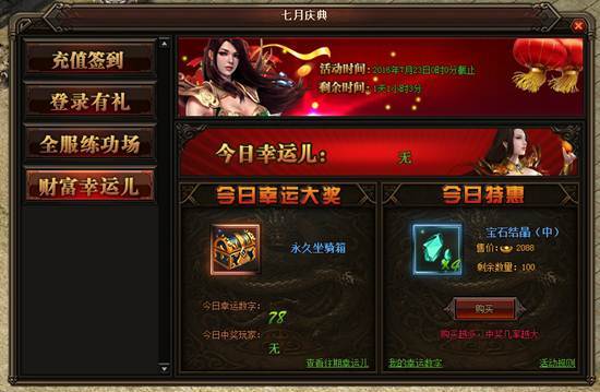 活动详情:活动期间每天0-21点可以购买特惠礼包,每服限量100个,购买特惠礼包可以获得1-100的幸运数字,数字不会重复,每天的21:00系统会随机抽取一个幸运数字,中奖的玩家将会获得该日的幸运大奖,奖品会通过邮件的方式发放给玩家。