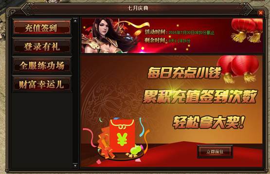 活动详情:每日充小钱,累积拿大礼,活动期间玩家每日充值10及1000元档次奖励,即可分别累计一次对应的充值签到次数,累计的充值次数达到对应的次数即可领取超级大奖哦。