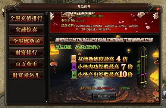 活动详情:小伙伴们是不是在为上次的练功房没有多买点时间而懊恼呢,不要桑心~~练功房又来了哦。活动期间玩家可以购买练功场时间,练功场分初级、中级、高级区域,每个区域的时间及价格不同,全服购买练功时间达到相应等级后开启全服练功场。黄色等级条要求全服购买时间为50小时、紫色等级条要求全服购买时间为500小时、绿色等级条要求全服购买时间为1500小时,每个等级所获得的奖励各不相同。