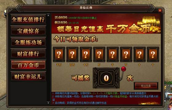 活动详情:活动期间充值领取每日充值5档奖励,分别可获得4、1、1、1、1次摇杆次数,摇杆的次数会从低到高显示,每日充值的档次后面一档都会高出前面10倍金币收益,如果一天5档的领完就可获得当天金币的最大收益,获得的金币将在每日0点通过邮件的方式发送给玩家。