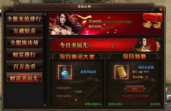 活动详情:活动期间玩家可在今日特惠里以优惠的价格购买相应的道具,每购买一次便可获得相应的一个幸运数字。系统会随机抽取一个幸运数字,每日21:00开奖,如果被系统抽到的幸运玩家就可获得今日幸运大奖,数量有限先到先得。