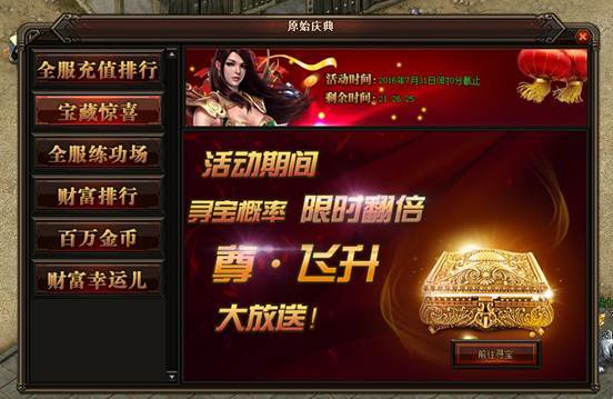 活动详情:活动期间寻宝几率增加,绝飞升首饰、护具也都有很大几率可以寻到,更有尊·飞升大放送,不要错过这个难得的机会哦~~~