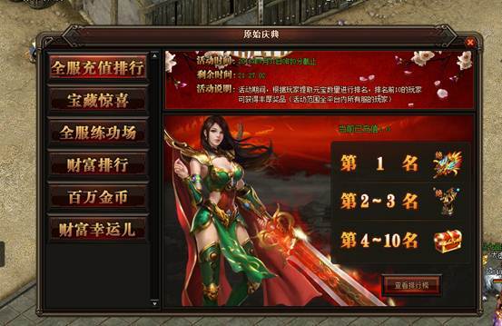 活动详情:活动期间系统会根据玩家提取的元宝数量来进行排名,此活动是按照全服的充值榜来算的,排名前10名会获得极品绝·飞升武器、绝·飞升衣服、绝·飞升防具箱。奖品会在活动结束后次日通过邮件发放给玩家。