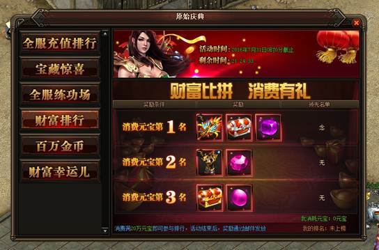 活动详情:活动期间消费满20W元宝就可以参与排行,活动结束后奖励会已邮件的方式发放给玩家,一定要记得提取~