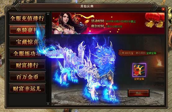 活动详情:活动期间玩家可以购买坐骑宝箱,宝箱可以随机开出坐骑碎片,玩家可以通过碎片合成完整坐骑,更有几率直接开出完整坐骑哦~