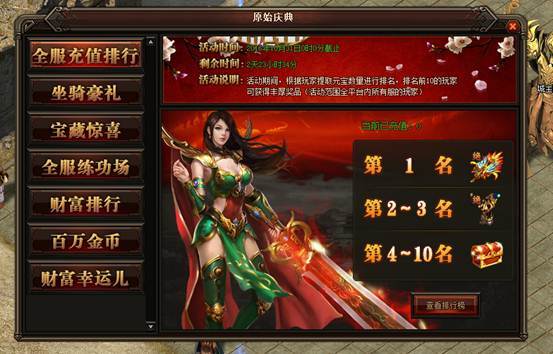 活动详情:活动期间系统会根据玩家提取的元宝数量来进行排名,此活动是按照全服的充值榜来算的,排名前10名会获得极品绝·飞升武器、绝·飞升衣服、绝·飞升防具箱。奖品会在活动结束后次日通过邮件发放给玩家。