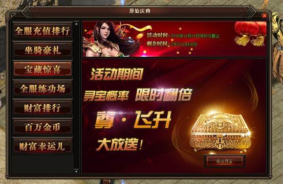 活动详情:活动期间寻宝概率大增,限时翻倍,更有尊飞升装备等你来拿~