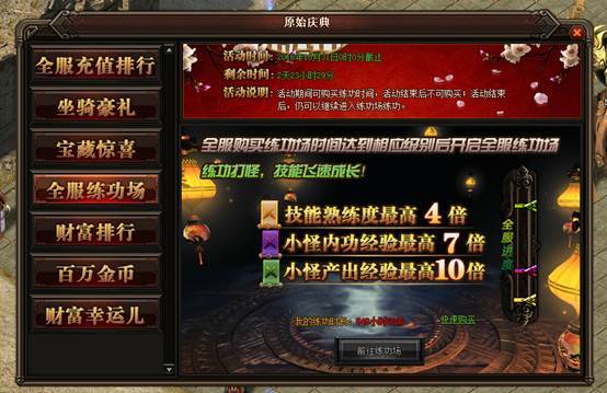 活动详情:小伙伴们是不是在为上次的练功房没有多买点时间而懊恼呢,不要桑心~~练功房又来了哦。活动期间玩家可以购买练功场时间,练功场分初级、中级、高级区域,每个区域的时间及价格不同,全服购买练功时间达到相应等级后开启全服练功场。黄色等级条要求全服购买时间为50小时、紫色等级条要求全服购买时间为500小时、绿色等级条要求全服购买时间为1500小时,每个等级所获得的奖励各不相同。
