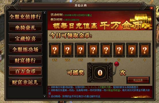 活动详情:活动期间充值领取每日充值5档奖励,分别可获得4、1、1、1、1次摇杆次数,摇杆的次数会从低到高显示,每日充值的档次后面一档都会高出前面10倍金币收益,如果一天5档的领完就可获得当天金币的最大收益,获得的金币将在每日0点通过邮件的方式发送给玩家。