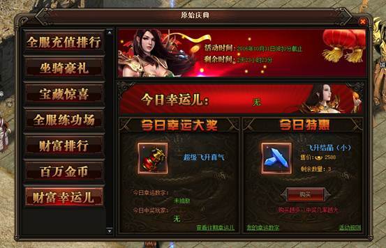 活动详情:活动期间玩家可在今日特惠里以优惠的价格购买相应的道具,每购买一次便可获得相应的一个幸运数字。系统会随机抽取一个幸运数字,每日21:00开奖,如果被系统抽到的幸运玩家就可获得今日幸运大奖,数量有限先到先得。