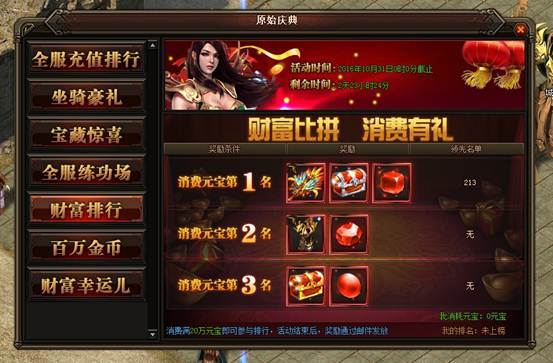 活动详情:活动期间消费满20W元宝就可以参与排行,活动结束后奖励会已邮件的方式发放给玩家,一定要记得提取~