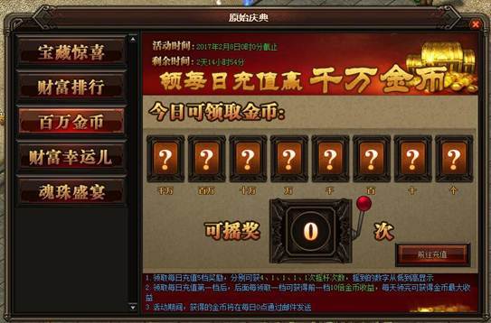 活动详情:活动期间充值领取每日充值5档奖励,分别可获得4、1、1、1、1次摇杆次数,摇杆的次数会从低到高显示,每日充值的档次后面一档都会高出前面10倍金币收益,如果一天5档的领完就可获得当天金币的最大收益,获得的金币将在每日0点通过邮件的方式发送给玩家。