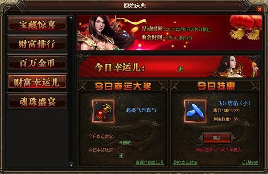 活动详情:活动期间玩家可在今日特惠里以优惠的价格购买相应的道具,每购买一次便可获得一个随机幸运数字;购买越多,中奖几率越大;每日21:00开奖,中奖数字所属玩家将会获得当日幸运大奖,奖励通过邮件发放。