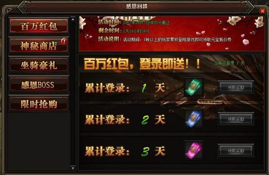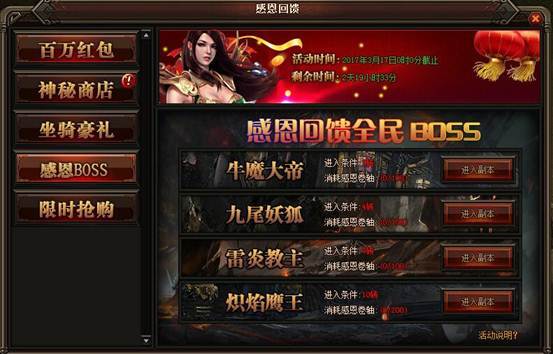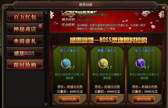 活动详情:活动期间玩家可以以超低的折扣价格购买BOSS灵魂礼包,礼包每人每天限购10次,小伙伴们不要错过哦