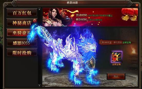 活动详情:活动期间,花费988元宝便可获得坐骑宝箱,坐骑宝箱有几率开出永久终极坐骑原始神龙,不要错过哦~