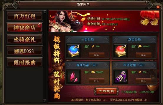 活动详情:玩家最期待的神秘商店又来了哦,小伙伴们可以使用金币、礼金、元宝在神秘商店内购买所需道具,只要399元宝就可以进行刷新,每样道具只能购买一次,如果这一页的道具购买完了可以免费刷新一次。