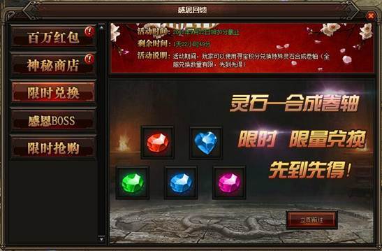 活动详情:活动期间,玩家可以使用寻宝积分兑换特殊灵石合成卷轴(全服兑换数量有限,先到先得)