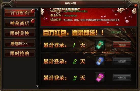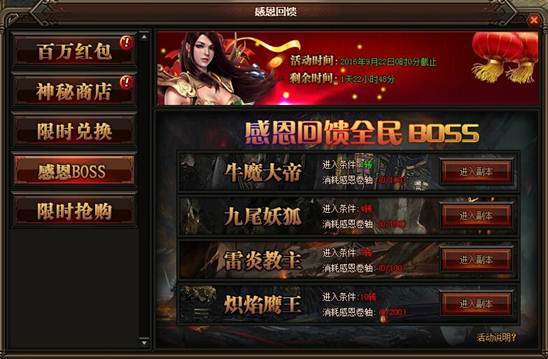 活动详情:活动期间玩家可在挂机地图里打小怪来获得感恩卷轴,例如祖玛寺庙、赤月峡谷、牛魔寺庙、魔龙城、狐月山谷、冰晶神殿、雷炎魔窟、苍月岛等都可以获得感恩卷轴,玩家获得感恩卷轴后可消耗相应卷轴进入副本,副本要求等级为1转、4转、7转、10转、想对应消耗的卷轴为100卷轴、100卷轴、100卷轴、200卷轴。BOSS会随机爆出2、4、6、8转装备不等。