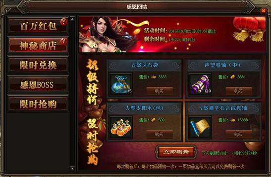 活动详情:玩家最期待的神秘商店又来了哦,小伙伴们可以已使用金币、礼金、元宝在神秘商店内购买所需道具,只要399元宝就可以进行刷新,每样只能购买一次,如果这一页的购买完了可以免费刷新一次。