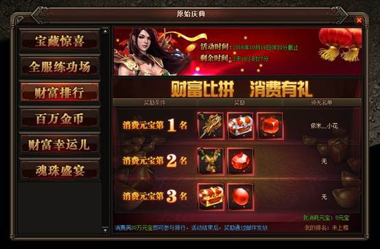 活动详情:活动期间,消费满20万元宝即可参与排行,活动结束后奖励会通过邮件的方式发放给玩家~