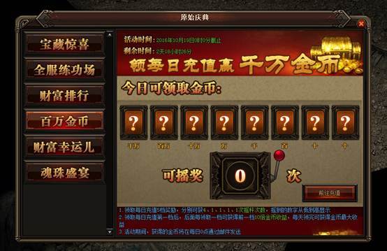 活动详情:活动期间充值领取每日充值5档奖励,分别可获得4、1、1、1、1次摇杆次数,摇杆的次数会从低到高显示,每日充值的档次后面一档都会高出前面10倍金币收益,如果一天5档的领完就可获得当天金币的最大收益,获得的金币将在每日0点通过邮件的方式发送给玩家。