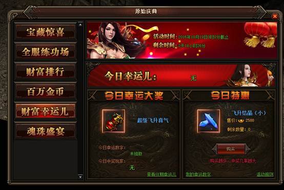 活动详情:活动期间玩家可在今日特惠里以优惠的价格购买相应的道具,每购买一次便可获得相应的一个幸运数字。系统会随机抽取一个幸运数字,每日21:00开奖,如果被系统抽到的幸运玩家就可获得今日幸运大奖,数量有限先到先得。