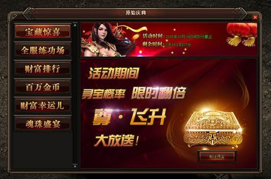 活动详情:活动期间寻宝概率大增,限时翻倍,更有尊飞升装备等你来拿~