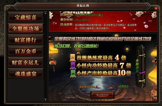 活动详情:小伙伴们是不是在为上次的练功房没有多买点时间而懊恼呢,不要桑心~~练功房又来了哦。活动期间玩家可以购买练功场时间,练功场分初级、中级、高级区域,每个区域的时间及价格不同,全服购买练功时间达到相应等级后开启全服练功场。黄色等级条要求全服购买时间为50小时、紫色等级条要求全服购买时间为500小时、绿色等级条要求全服购买时间为1500小时,每个等级所获得的奖励各不相同。