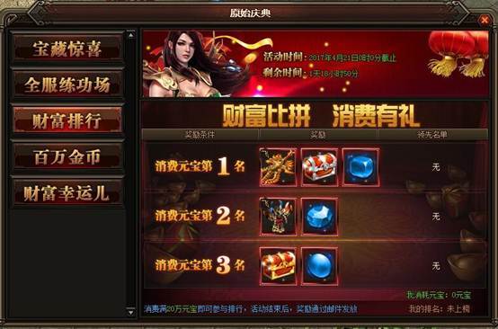 活动详情:活动期间,消费满20万元宝即可参与排行,活动结束后奖励会通过邮件的方式发放给玩家~