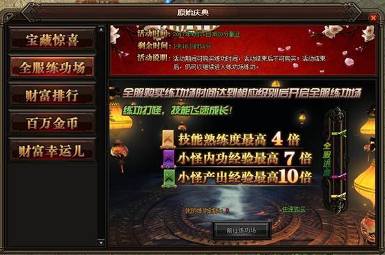 活动详情:活动期间可购买练功时间,全服购买练功场时间达到相应级别后开启全服练功场,经验、技能熟练度飞速增长