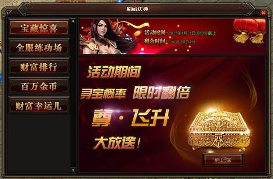 活动详情:活动期间寻宝概率限时翻倍,更有几率直接开出尊·飞升装备哦~