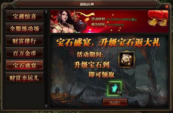 活动详情:宝石盛宴,升级宝石返大礼,活动期间升级宝石达到对应要求既可领取大礼,快快参与吧!